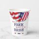 This design features red, white, and blue bunting across the top and stars along the bottom with "Land of the FREE because of the BRAVE" message on both sides of the handle. Great picnic or party accessory.