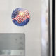 This round magnet is shown with a image print of a patriotic USA Flag and fireworks.