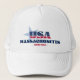 Massachusetts trucker hat. A bold typography design with a blue star that highlights the US state of Massachusetts, its year of statehood in 1788, and the initials of the USA infused with the stars and stripes of the American flag. It makes a wonderful patriotic gift or souvenir.