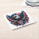 These paper coasters are shown in a patriotic July 4th stars and stripes eagle print design.