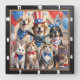 This charming wall clock features a delightful group of patriotic pets, including dogs, cats, and a bunny, adorned in festive red, white, and blue bandanas and hats. Set against a backdrop of balloons and an American flag, this unique timepiece is perfect for animal lovers and adds a whimsical touch of national pride to any home decor.