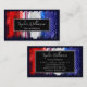 This elegant and glamourous business card features red, white and blue patriotic brush strokes with sequins and glitter on a black background. The text combines handwritten script and modern sans serif fonts for a classy and sophisticated look. This is perfect for make up artists, beauticians, spas, fashion stylists, interior design and more.