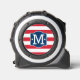 Patriotic personalised tape measure design features a decorative frame with custom monogram initial, star accents, and horizontal stripes. Navy blue, red, and white colours.