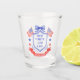 This patriotic bridal shower shot glasses features a watercolor crest with a light red white and blue patriotic crest with American flags and a blue bow. Text in the centre of the crest says "Red, white and I do." You can personalise with your event date.