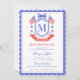 This patriotic bridal shower invitation features a watercolor crest with a light red white and blue patriotic crest with American flags and a blue bow. There is a cute scalloped blue border around the edge. You can personalize with your monogram.