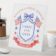 This patriotic bridal shower "Cards and Gifts" sign design features a watercolor crest with a light red white and blue patriotic crest with American flags and a blue bow. You can personalize with your event details.
