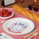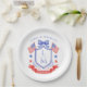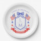 This patriotic wedding paper plate design features a watercolor crest with a light red white and blue patriotic crest with American flags and a blue bow. You can personalize with your monogram, wedding date and names.
