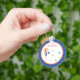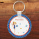 Personalized keychain with an illustration of a rhythmic gymnast with a ball and stars. The background is navy blue with white stars. Personalize the keychain with your name or personal message. Illustrated and designed by Patricia Alvarez.