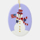 A cute patriotic Christmas snowman ceramic ornament. This lovely double sided patriotic ornament features an illustration art of a snowman wearing stars and striped gloves, scarf and an Uncle Sam style top hat by XG Designs NYC. His buttons are golden stars, and he is carrying an American flag in his his hand too! This adorable ornament would be a great gift for family, friends or relatives who are veterans, or currently serving in one of the branches of the U.S. Military. Also, a lovely little gift for the family of a serviceman too! For more designs of patriotic Christmas greeting cards, ornaments, and gift items please visit our shop!