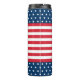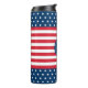 A bold patriotic thermal tumbler featuring an American flag-inspired design with navy blue and white stars, red and white stripes, and a custom monogram initial in a navy circle at center. The classic stars and stripes pattern wraps the full tumbler for an eye-catching, all-American look. Perfect for Fourth of July celebrations, summer cookouts, or everyday use by anyone who loves Americana style. All text is fully customizable.