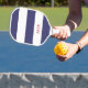 This patriotic American pickleball paddle design features a blue and white striped pattern, with your initials in bold red text for a look that is simple and stylish, yet professional. Perfect for the Fourth of July and all of your Independence Day, 4th of July parties!