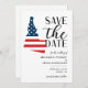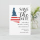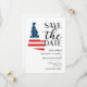 Patriotic Idaho destination wedding save the date with a US state and flag illustration.