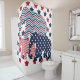 Shower curtain featuring three elephants in chevron stripes, diagonal stripes, and polka dots in red, white, blue, and navy blue on a white background with red and navy blue stars!
