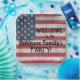 Vintage distressed Patriotic USA Flag, red white and blue stars and stripes, on stone wall tiles. The calligraphic text is customisable.