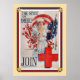 Vintage woman with red cross on hat is holding the flag pole and has a billowing American flag in background. Text says The Spirit of America...Join. Patriotic art by Christy H. Chandler in aid of the American war effort.