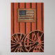 Beautiful patriotic wall poster would be a lovely addition to any home. Framed Old Glory with the words "Land of the Free, Because of the Brave" hanging on the side of country barn with wagon wheels .. Makes a beautiful wall hanging framed.