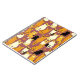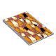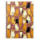 Notebook in a playful pattern of stylised cats in warm shades of ginger, cream, black, and brown on a caramel brown background. Each cat has its own cute expression and markings, with little paw prints scattered throughout.
