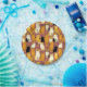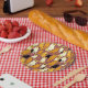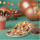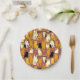 Paper plates patterned in a playful pattern of stylised cats in warm shades of ginger, cream, black, and brown on a caramel brown background. Each cat has its own cute expression and markings, with little paw prints scattered throughout.