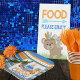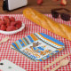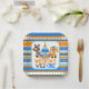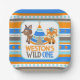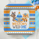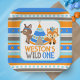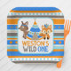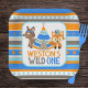 Patterned Wild One First Birthday Paper Plates in Blue, Orange, Tan and Brown. Featuring an adorable forest fox, deer and tribal inspired teepee tent. Part of our "Wild One" collection, but also works great for a "One Happy Camper" theme!