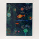 This famous painting is by bauhaus abstract artist Paul Klee showcasing modernism with abstract fish swimming through a black blue ocean. A graphic art abstract expressionist painting.