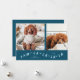 Minimal and modern holiday photo template card featuring 2 photos of your pet on the front with a fun typography text that says "Paw-La-La-La-La." You can also add another picture and message on the back. The background is teal.