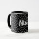 Paw print mug with name. Grey paw print pattern on black background and white custom name. Personalise by replacing the sample name Nicole with your own name or custom name or text of your choice. Awesome personalised gift idea for a cat mum, dog owner or any other pet animal lover.