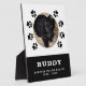 Paw Print Pet Dog Photo Memorial Keepsake plaque. This dog loss plaque has a photo of a dog and name with a black animal paw print pattern in a circle around the photo. A great keepsake gift and in memory of for a dog owner.