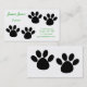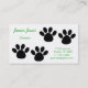 This fun business card is perfect for a dog groomer.  It has a two sets of black paw prints on the front with green text.  The back features a set of huge paw prints.