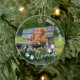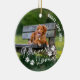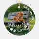 Dog memorial ornament printed with a photo of your beloved dog, one on either side. Add your dog's name and years living in a curved modern text. Forever loved at the bottom of the dog photo ornament adorned with little dog paw prints. Honour your dog who's passed away with this pet memorial forever loved ornament personalised with photos of your dog and their name, year of birth, and year of passing.
