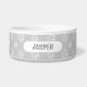 Pawsome Paw Prints Heart Pattern pet dog or cat bowl in grey shades with a name label, for the cutest furry buddy. Select the size and easily personalise the text. - Kate Eden Art