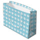This gift bag displays a pattern of white paw prints on a blue background. This is a great item for paw print themed, dog themed, cat themed, or animal themed baby showers.