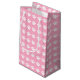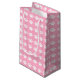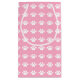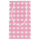 This gift bag displays a pattern of white paw prints on a pink background. This is a great item for paw print themed, dog themed, cat themed, or animal themed baby showers.