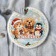Celebrate the holidays with irresistible cuteness in this charming Christmas animal design. Featuring an adorable trio—a ginger cat in a Santa hat holding a wrapped gift, a golden retriever puppy wearing a plaid scarf with a gingerbread bone, and a sweet penguin in earmuffs and a bow tie clutching a candy cane—this scene radiates festive joy. Set in a snowy winter landscape with distant mountains and framed by a decorative scalloped border accented with golden glitter swirls and holly, the playful phrase “Paws & Claus” completes the look. Perfect for animal lovers, this design captures the warmth, whimsy, and cheer of the Christmas season.