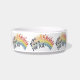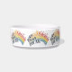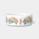 This is a heavy, durable bowl decorated with Tibbies of many colors, the perfect size for hungry/thirsty Tibs. The design is interesting and printing clear.