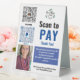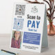 Venmo business transactions are increasing. Connect with customers by adding a photo and a custom message. If you are contemplating a Venmo business vs. personal account it is well worth the small fees. Scanning a QR code allows people to pay for goods and services through a digital wallet when they have run out of cash. You can increase your sales by adding your Venmo or PayPal QR code to tabletop Pay HERE signs at your next popup event or craft show. Digital payment systems are essential. Pay with Venmo or a PayPal QR code is easy, convenient, and fun for customers. Safe and secure. This pay-here sign is a must for your small business. Customise with your business name and company website.