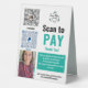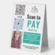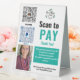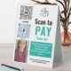 Venmo business transactions are increasing. Connect with customers by adding a photo and a custom message. If you are contemplating a Venmo business vs. personal account it is well worth the small fees. Scanning a QR code allows people to pay for goods and services through a digital wallet when they have run out of cash. You can increase your sales by adding your Venmo or PayPal QR code to tabletop Pay HERE signs at your next popup event or craft show. Digital payment systems are essential. Pay with Venmo or a PayPal QR code is easy, convenient, and fun for customers. Safe and secure. This pay-here sign is a must for your small business. Customise with your business name and company website.