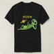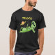 Green alien just chillin' giving the peace sign with a planet and stars above him on a black shirt.