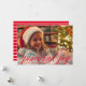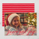 Seasonal photo card features a "Peace and Joy" red colored handwritten calligraphy script overlay design with custom modern serif text that can be personalized with the year and your family / name. The back of the card includes abstract white horizontal stripes with a red colored background.