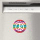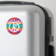 Show some peace and love with this white peace sign and heart shape with the text "Peace & Love". Background is colourful tie dye style stripes in a rainbow of colours including red, pink, green, blue, purple, orange and yellow.