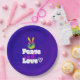 Funky cool paper plates with peace and love written in a groovy typography font. The illustration is a hand-shaped peace symbol, fingers raised in the classic v sign all made in rainbow colours. A little doodle heart beside the word love. Psychedelic groovy design. Acid purple background.