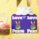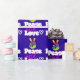 Funky cool wrappng paper with peace and love written in a groovy typography font. The illustration is a hand-shaped peace symbol, fingers raised in the classic v sign all made in rainbow colours. A little doodle heart beside the word love. Psychedelic groovy design. Acid purple background.