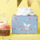 White dove flying with red PEACE message on a red and white striped string a blue winter snowflake background.