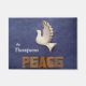 photo of white dove with the word peace in letterpress wood letters on a blue, sparkly background