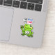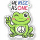 Cut-out sticker with a cute green frog with peace sign that says, "We Rise as One."