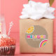 Groovy baby shower theme featuring peace sign incorporated into "Welcome" text with custom text for name. Sunshine at top left and rainbow at right over cardstock inspired sunburst background.