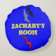 Fun cartoon character Happy Spaceship. BACK of Pillow has lightning bolts and area to personalise with Name's Room in a cool eyeballs font. Happy Spaceship has funny, colourful green eyes, squiggly brown eyelashes, a yellow nose and a happy smile, with a black bottom with look of 3D blue stud lights and yellow beams of light underneath, back of ship has silver exhaust tubes, and funny yellow alien faces and colourful peace signs in blue, red, yellow, green, orange, purple leading the way up into the sky with blue stars. Colourful Spaceship for anyone who loves space, galaxy, groovy peace signs, happy faces. Original Artwork © 2014 TamiraZDesigns.