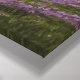 A lush, green meadow filled with vibrant purple wildflowers stretches across the foreground under a bright blue sky. Misty mountains rise majestically in the background, creating a serene and tranquil landscape.
