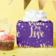 Peace Joy Love gold text with white stars on a purple background.