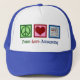 A cute accountant hat featuring a peace sign, heart, and calculator. Peace Love Accounting gift for a CPA.