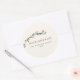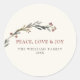 This elegant "Peace, Love & Joy" holiday round sticker feature modern and minimal watercolor greenery with red berries on a neutral background. The text is easily personalised with your choice of greeting, family name, year.